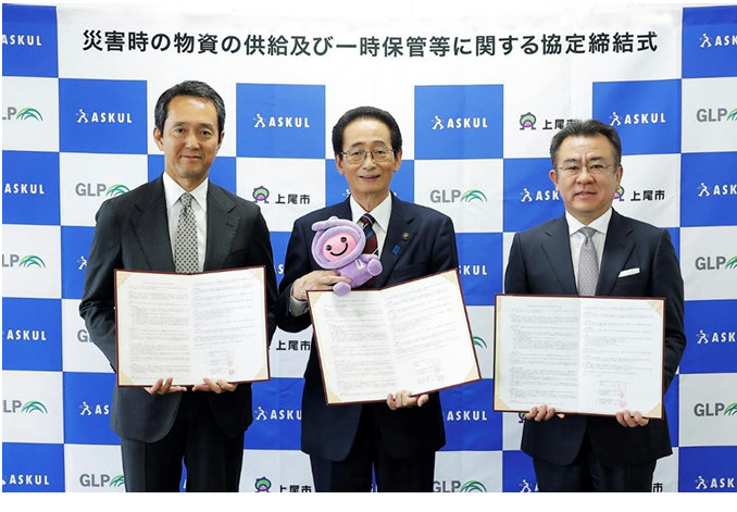 また、埼玉県上尾市(畠山稔市長)およびアレス・マネジメント・コーポレーション(ニューヨーク証券取引所:ARES)の一部である日本GLP(株)(東京都中央区、帖佐義之社長)の3者間で「災害時の物資の供給及び一時保管等に関する協定」を締結した。