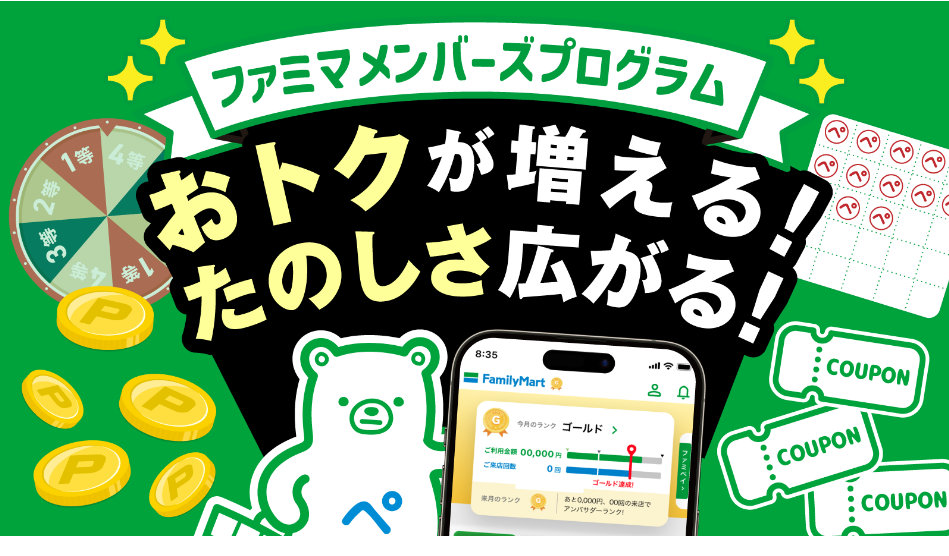 「ファミマ メンバーズプログラム」は、ファミリーマートでの買物時に「ファミペイ」を提示して購入すると、月間の来店回数と購入金額によって翌月のランクが決定し、ランクに応じて特典が進呈されるおトクな会員プログラム。会員ランクによって、達成月の翌月に会員ランク限定のクーポンやポイントなどを進呈する。