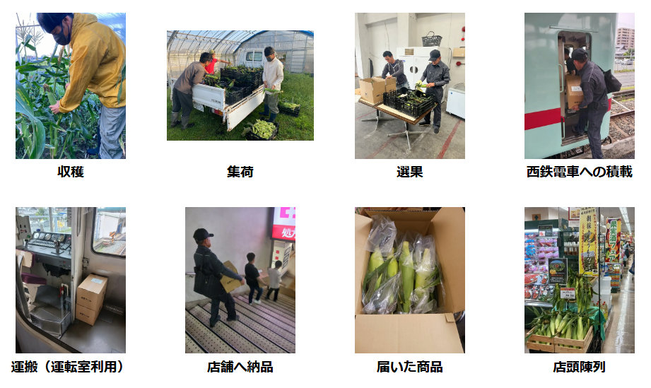 この事業は、朝収穫した野菜を大善寺駅の列車に積載し、高宮駅まで輸送。到着後は、高宮駅直結のスーパーマーケット「にしてつストア高宮店」内の特設ブースで店頭販売を行う。とうもろこしは「バイカラーコーン(品種:ドルチェドリーム)」で、本体価格で299円/本で販売する。