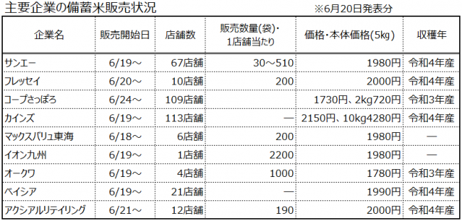流通スーパーニュース > 戦略 > 備蓄米news|主要チェーンの販売状況/令和4年産と3年産で価格差 備蓄米news|主要チェーンの販売状況/令和4年産と3年産で価格差 戦略 / 2025年06月23日 ツイート 主要チェーンが6月20日(金)時点で発表した政府備蓄米の販売状況は次の通りとなった。 令和3年産を扱うチェーンが出てきた。販売価格では令和4年産が1980円から2000円(本体価格)であるのに対し、令和3年産で1700円台と価格差が出ている。 また、多くのチェーンが基本的に店頭販売のみで1人当たり1袋、1日1回の販売となっている。コープさっぽろは宅配を予定している。 ツイート