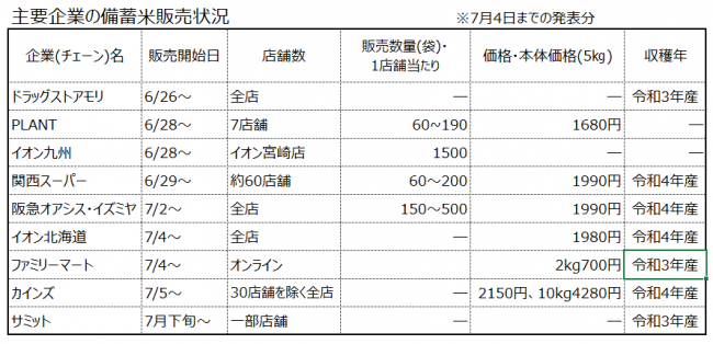 主要チェーンが7月4日(金)時点で発表した政府備蓄米の販売状況は次の通りとなった。