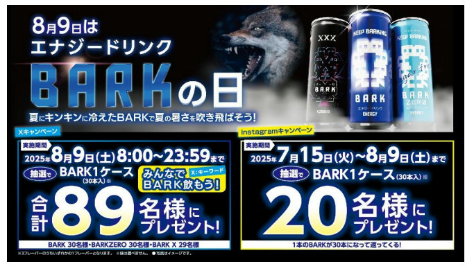 さらに、ベルク公式X(@belc_jp)をフォローして同ポストに「#今日はエナドリBARKの日」のハッシュタグ、ベルクの隠されたキーワードとともに引用リポストすると、抽選で計89名に「BARK1ケース(30本入)(3種のうちいずれか1種)」をプレゼントする。また7月15日~8月9日の期間、ベルク公式Instagramをフォローし、自身のInstagramに「#エナジードリンクBARKの日2025」のハッシュタグ入れてBARK商品を楽しんでいる写真をUPすると、抽選で20名に「BARK1ケース(30本入)(3種のうちいずれか1種)」をプレゼントする。