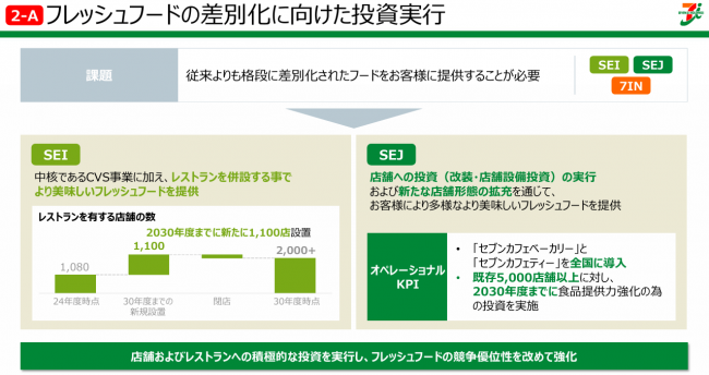 国内コンビニ事業は5年後の2030年度までに既存5000店舗以上に対して食品提供力強化のための改装や店舗設備に3000億円を投資する。「セブンカフェベーカリー」と「セブンカフェティー」などカウンターフーズを全国に順次導入する。