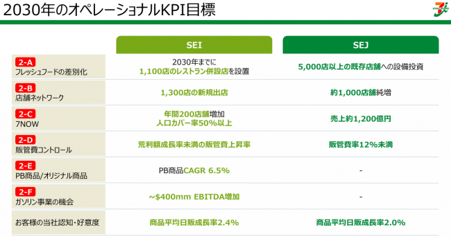 デリバリーサービスの「7NOW」は2030年度までに、売上高を現在の10倍となる約1200億円に増加させる。また、営業面でのKPIでは、販管費率12%未満、セブン-イレブンの平均日販2%アップを掲げた。