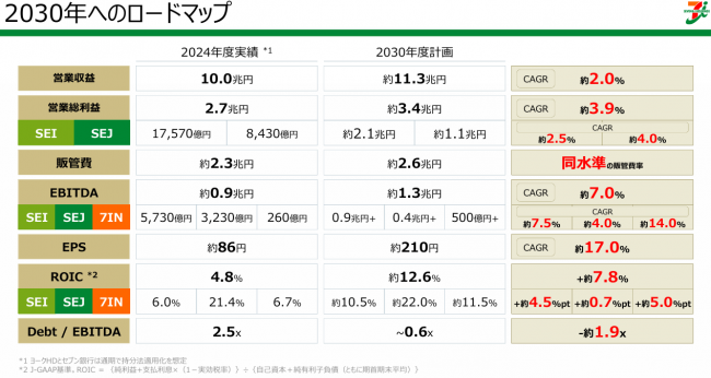 2030年度へのロードマップとして、セブン&アイ全体の営業収益は約11.3兆円、営業総利益約3.4兆円を掲げた。