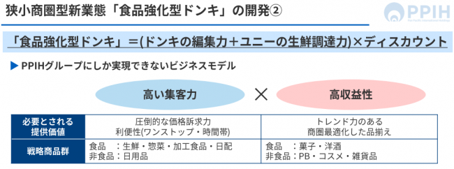 ユニーの生鮮調達力とドンキの売場編集力を合わせることで、ドンキの出店パターンの一つである狭小商圏型の小型フォーマットの構築を図るもの。ドンキが主力とする非食品マーケットの縮小が続いていることから、消費支出が伸びている食品の構成比を高める。改装投資で、売場面積の6割を食品に充てることで非食品構成比の売上げを25%程度に抑える。来店頻度の向上を図り、売上げ1.5倍を目指す。