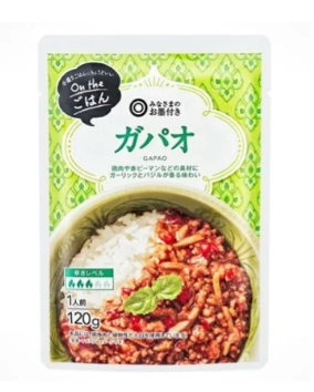 「On the ごはん ガパオ」は、鶏肉と赤ピーマンを中心に、バジルとガーリックの香りを効かせたタイ風の味わい。少しピリ辛で具材はたっぷり、シャキシャキ感も満足感もある商品。120gで189円。