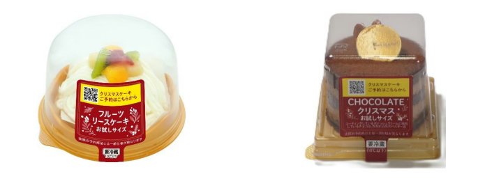 リョーユーパン「フルーツリースケーキ」お試しミニケーキ398円、イケダパン「CHOCOLATEクリスマス」お試しミニケーキ398円。