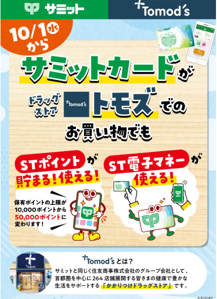 サミット(株)(東京都杉並区、服部哲也社長)が展開している「サミットカード」が、10月1日(水)から、(株)トモズが運営するドラッグストア「トモズ」「アメリカンファーマシー」「インクローバー」でも使用できるようになる。