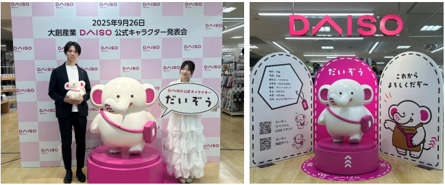 「だいぞう」の誕生を記念して、9月26日から全国のDAISO店舗で、来店客にだいぞうステッカーを贈呈する(なくなり次第終了)。また、同日リニューアルオープンする「DAISO アルカキット錦糸町店」には、等身大の「だいぞう」フィギュアを設置し、一緒に撮影できるフォトブースを用意する。さらに「DAISO アルカキット錦糸町店」では全店に先駆けて「だいぞう」のぬいぐるみやキーホルダーを数量限定で発売する。