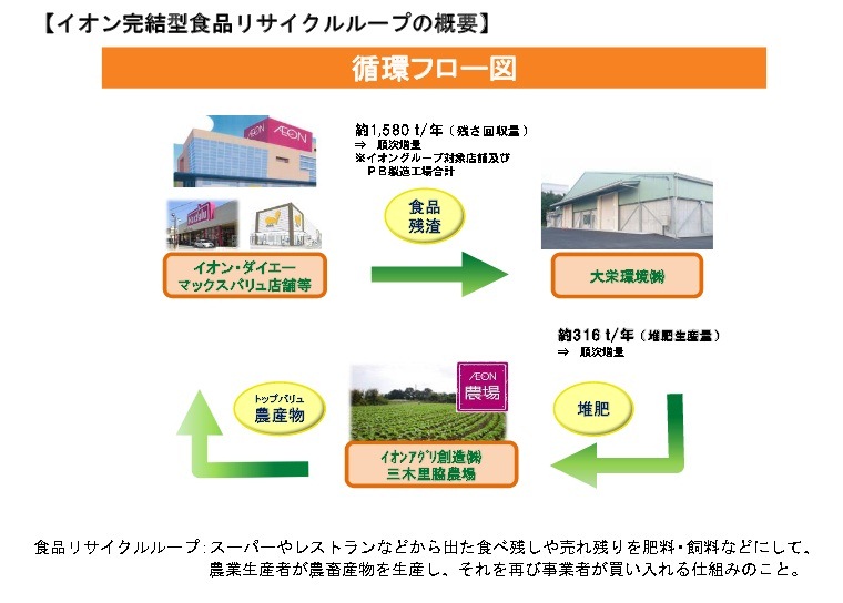 今回は、イオン三木里脇農場周辺の総合スーパー「イオン」や「ダイエー」、食品スーパー「マックスバリュ」の店舗などで発生する野菜・肉などの食品残さを、大栄環境の堆肥化施設で堆肥に加工し、近接するイオン三木里脇農場で使用する。これは店舗から生産機能への逆流である。さらに残さ堆肥で栽培・収穫された野菜は、イオンの店舗で販売される。