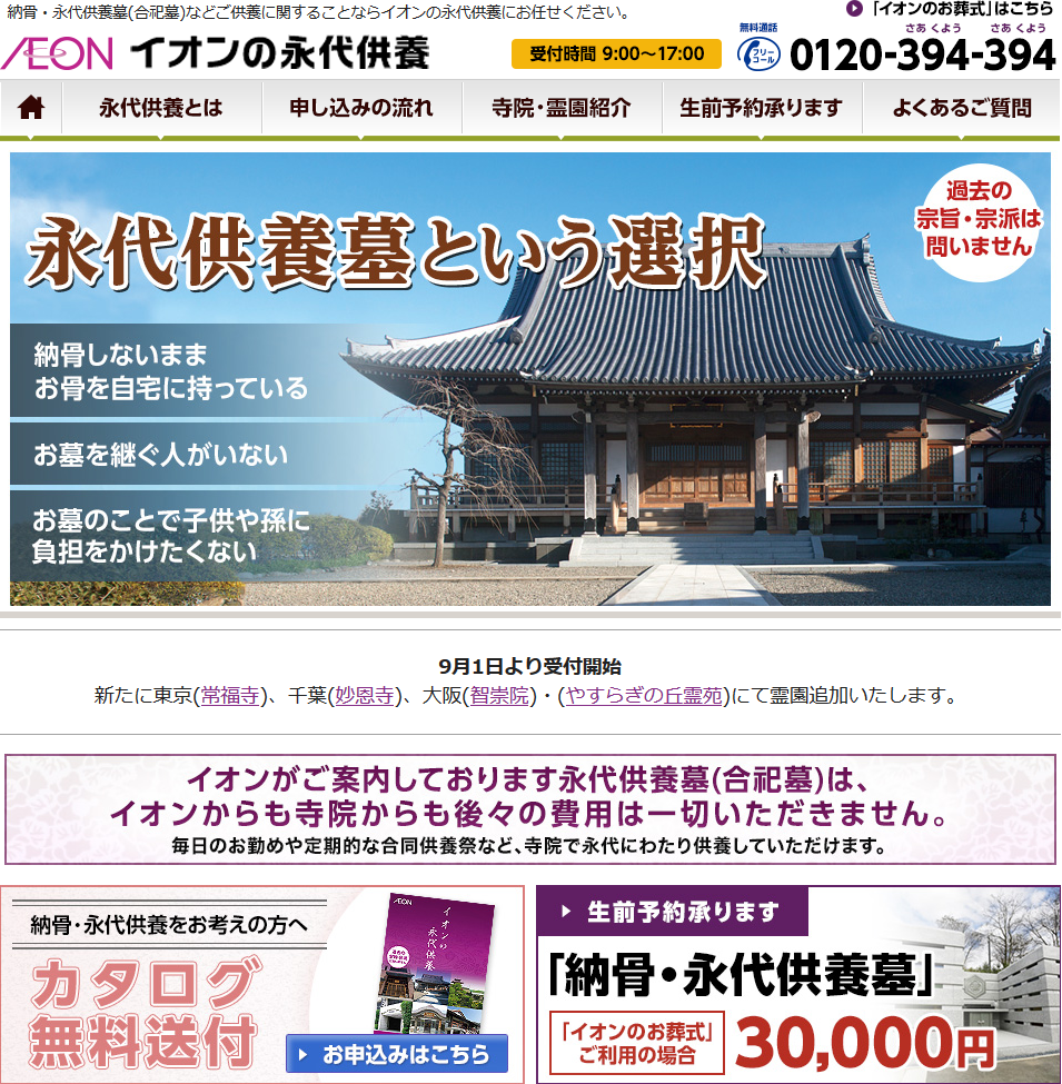 同社は2009年から全国540社の葬儀社と提携し、「イオンのお葬式」を展開しているが、2013年9月から始めたサービスは、3万5000円。過去の宗旨、宗派を問わず、また後々の追加料金が一切かからない納骨・永代供養ができる合祀墓、埋葬料、永代使用料、永代供養料、永代管理料などすべて含んだサービスである。さらに「イオンのお葬式」を生前予約した顧客、または利用した顧客には、同じサービスを3万円で紹介している。同サービスは既に各地に広がっているが、それが世田谷区で始まる。