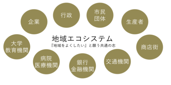 エコシステム(ecosystem)とは「生態系」を意味する言葉であり、「地域」という生態系の中にいる複数の企業やさなざまプレーヤーが関わり合い、つなぎあい、ひとつになって共に創り上げ、循環しながら広く共存共栄し、成長していく仕組みのことである。