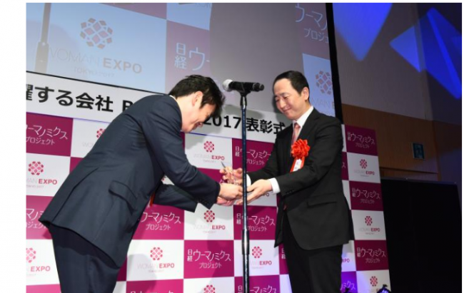 イオンは、第1に女性が働きがいを持ち活躍していくために専任組織を設置し、グループ会社とともにダイバーシティ推進活動を行っていること、第2に組織横断的な女性社員向けの研修の実施、第3に人事制度の改定、第4に「イクボス」の育成などが評価された。