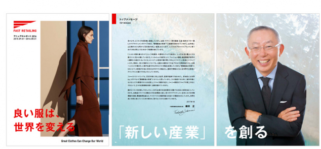 ファーストリテイリングのアニュアルレポート2016は、「良い服は、世界を変える」をテーマに掲げ、服のビジネスと服を通じたCSR(企業の社会的責任)活動の両面から、世界をより良い方向に変えていくという思いが込められている。
