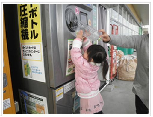 そのひとつが店頭でのリサイクル回収。現在24店舗にペットボトル自動回収機、2店舗に古紙回収機を設置している。ペットボトル1本につき2ポイント、古紙1kgにつき10ポイントが貯まり、500ポイントで50円の買物券と交換できる。