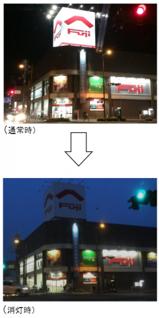 (株)フジ(愛媛県松山市、尾﨑英雄社長)は、環境省による「CO₂削減/ライトダウンキャンペーン」に参加し、夏至の6月21日(水)と、クールアース・デーの7月7日(金)に広告塔照明の消灯を実施する。