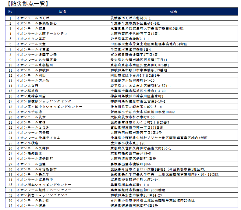 2017年6月末現在、防災拠点として全国のイオンモール、イオンの37施設を指定している。