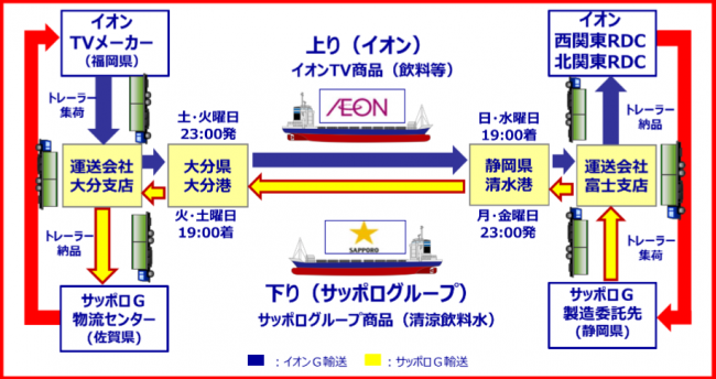 共同運航はRORO船の往復便を相互に有効活用して、環境負荷低減に取り組むのが狙い。具体的には、イオン側が福岡県内のトップバリュ生産工場から大分港、清水港の海上ルートを使用して、西関東RDC・北関東RDCへ商品を納品する。RDCとはリージョナル・ディストリビューション(地域配送)センター。
