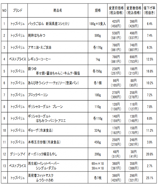 カテゴリー別の値下げ品目数は、食品75品目、リカー7品目、日用品19品目。