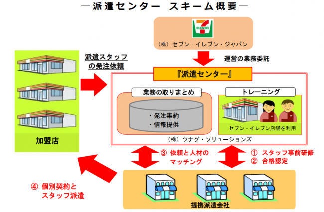 派遣センターとは、セブン‐イレブン・ジャパンが「セブン‐イレブン加盟店の派遣依頼の集約」「提携派遣会社への情報提供」「派遣スタッフの事前研修」等を通じて、加盟店の従業員確保をサポートするために、委託運営先の(株)ツナグ・ソリューションズ(東京都千代田区、米田光宏社長)と連携して進めているもの。