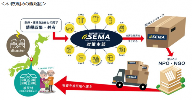 SEMAは、企業やNPOの垣根を越えた組織として、被災を最小限に食い止め、早期復興の足掛かりとなることを目指している。被災地での情報収集は、主にNPOが担当し、加盟企業は物資やサービスをリスト化することで迅速な対応をする。また公共機関との情報交換と連携を図って、支援の漏れや無駄を減らし、被災自治体の負担を削減する。
