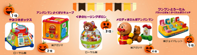 商品は、1位「やみつきボックス」、2位「アンパンマンよくばりキューブ」、3位「くまのヒーリングポロン」、4位「メロディおさんぽアンパンマン」、5位「ワンワンとうーたん」。