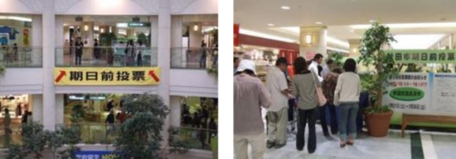 2016年6月に施行された改正公職選挙法では、選挙権年齢の満18歳以上への引き下げとともに、期日前投票所だけでなく投票日当日も「共通投票所」として商業施設内に設置することが可能となった。