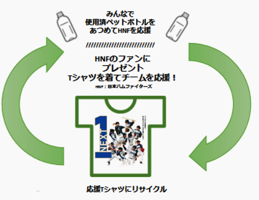 このプロジェクトでは、「来年こそは北海道日本ハムファイターズがリーグ一番になるよう応援しよう」という気持ちを込めて実施されるもの。3店舗から集められたペットボトルをポリエステル原料にリサイクルし、それを用いて応援Tシャツ5000枚を製作する。そして2018年春夏開催予定のイオン北海道協賛試合で来場者にプレゼントする。
