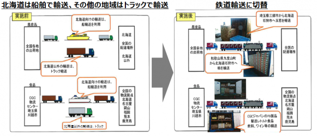 ②トラック輸送を鉄道輸送に切り替えることにより、CO2 排出量を削減した。