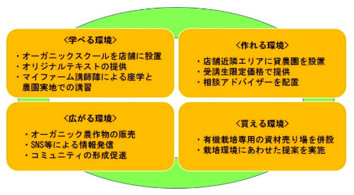 今回のスクールは、有機栽培について「学べる環境・作れる環境・買える環境・広がる環境」の4つのテーマで展開される。定員は30名で、3月から12月までの土曜日24講座。マイファームの講師がオリジナルテキストを用いながら、座学と実地学習を、シーズンを通して行う。また、貸農園サービスもあり、本格的に栽培できる環境も提供される。教室内には、有機栽培用の商材を揃えた売場も併設し、オーガニック商品を買える環境も整えられる。
