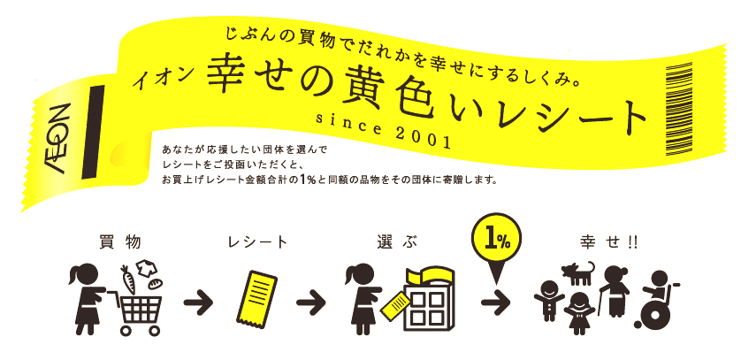 イオンでは2001年から、毎月11日の「イオン・デー」に、「イオン幸せの黄色いレシートキャンペーン」を実施している。このキャンペーンは、顧客に応援したいと思うボランティア団体のボックスにレシートを投函してもらい、レシート合計金額の1%相当の品物を、イオンからボランティア団体に贈呈する。