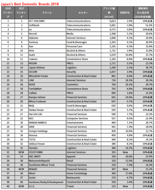 「Japan’s Best Domestic Brands 2018」の1位は「NTT DOCOMO」、2位は「SoftBank」、3位は「au」と、通信事業サービス3社が独占している。