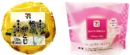 商品は2点。第1は、陸奥湾産帆立を使用し、青森県の郷土料理の貝焼き風に仕立てた「青森限定!卵でとじた陸奥湾産帆立おむすび」( 税込140円)。第2は、国内の生産量日本一を誇る、青森県産のカシスを使用した「カシスレアチーズもちぷにゃ(青森県産カシスのソース使用)」(税込128円)。