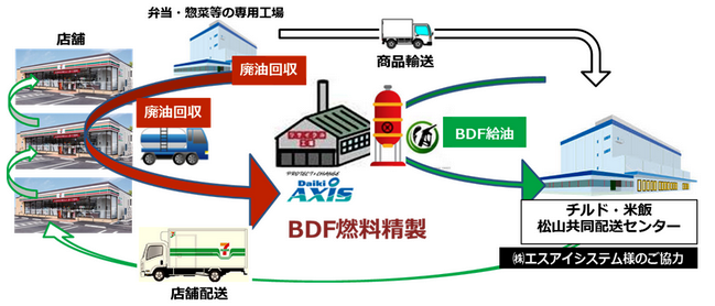 実証実験では、県内の家庭から回収された「使用済み天ぷら油」、県内のセブン‐イレブン99店舗で揚げ物惣菜を調理した後の食用油、セブン‐イレブンの弁当や惣菜等を製造する専用工場で使用した食用油をBDFとして用いている。