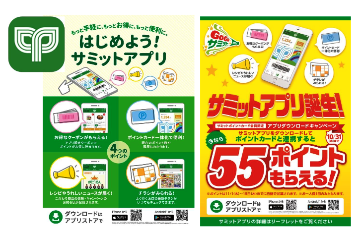 またアプリのリリースを記念して、全店でキャンペーンを実施する。サミットポイントカードを持った顧客が、10月31日までの期間にアプリをダウンロードして、ポイントカードと連携させると、55ポイントをプレゼントする。カードからアプリへの切り替えをキャンペーンで促していく。