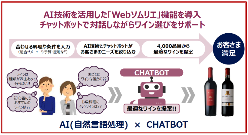 webソムリエは、自然言語処理ができるAI(人工知能)とCHATBOT(チャットボット)を組み合わせてる。顧客のワイン選びの際、対話しながらサポートする。CHATBOTとは、チャットとロボットをかけあわせた言葉で、コミュニケーションツールとして注目されている。
