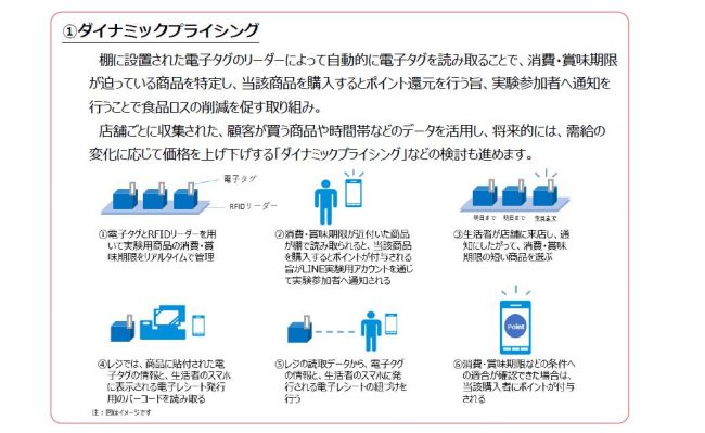 商品1つ1つに貼付された電子タグから、メーカー・卸売り・小売り・家庭などのサプライチェーンにおける在庫情報の可視化や食品ロスの削減などを、サプライチェーン各層が連携して解決することを目的にしている。