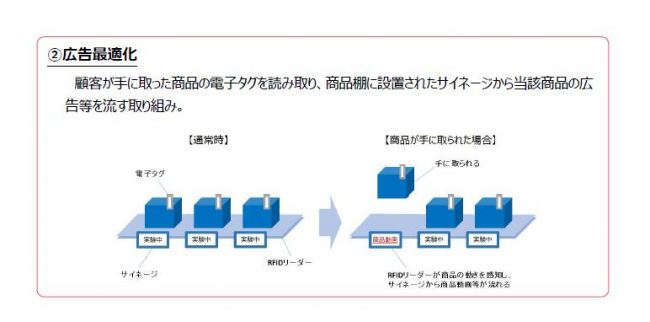 経済産業省ではコンビニ各社と共同で「コンビニ電子タグ1000億枚宣言」を2017年4月に策定した。これに基づき、2018年2月14日から、電子タグから取得した情報をサプライチェーンで共有する実験を始めた。