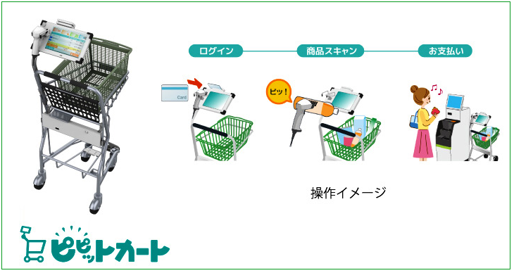 お客はピピットカートで店内を移動しながら、付属のスキャナで購入する商品をバーコードを読み取ってカートに入れていく。タブレット上には読み取った商品の明細や合計金額が表示されるため、リアルタイムで買上げ情報を確認できる。商品スキャンが完了しているため、レジには並ばず、直接セルフの会計機で決済できる。これによってお客の待ち時間は通常レジとの比較で約3分の一の時間で済む。