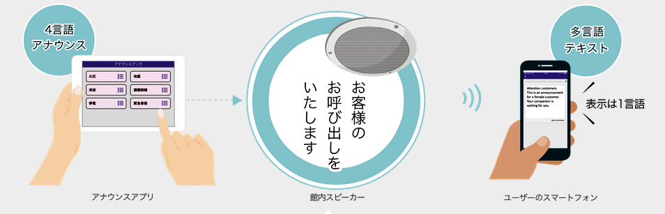 「おもてなしキャスト アナウンスアプリ」は、USENが展開している多言語対応のアプリだ。迷子の捜索や顧客の呼び出し、施設内のサービス案内や注意喚起などを日本語、英語、中国語、韓国語の4カ国語でアナウンスできる。またお客はアプリをインストールしていれば、館内で発せられる情報をテキストデータで受信することができる。