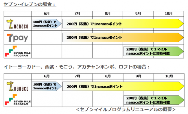 また7payのスタートに合わせて、「nanaco」ポイントと「セブンマイル」のグループの特典プログラムを変更する。