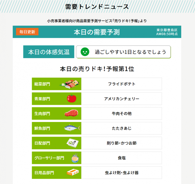 一般財団法人日本気象協会(東京都豊島区、石川裕己会長)は、小売業向けの商品需要予測サービス「売りドキ!予報」の関東版を2019年4月23日(火)から提供を開始している。