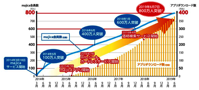 この間の2015年7月には「majicaアプリ」の配信を開始した。また2016年7月には、会計時にアプリの画面を提示するだけで買物ができる「カードレスサービス」と、買物履歴をアプリで確認できる「m!レシート」を加えている。このアプリ配信で、2年間で200万人だった新規ユーザーが400万人に跳ね上がったのがわかる。