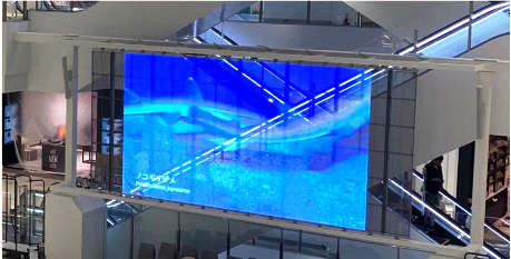 二つ目はポスターボードやフロアサインをデジタル化し、大空間を演出する透過型LEDビジョンを導入して演出する。沖縄地区最大級となる横7m×縦3mの透過型LEDビジョンは、500名収容可能な2階センタープラザに掲げられ、大型映像で大空間を演出する。イベント情報や沖縄の魅力を映像で訴求する。