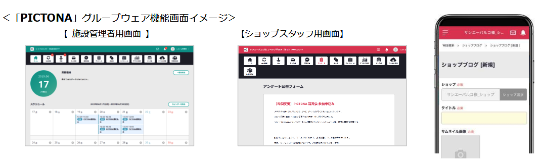 3つ目はバックシステムの運営支援だ。「PICTONA」グループウェア機能導入で、事務作業をデジタル化する。施設管理者とショップスタッフの情報共有が、スマートフォンやパソコンから、いつでもどこでも簡単に行えるようになる。