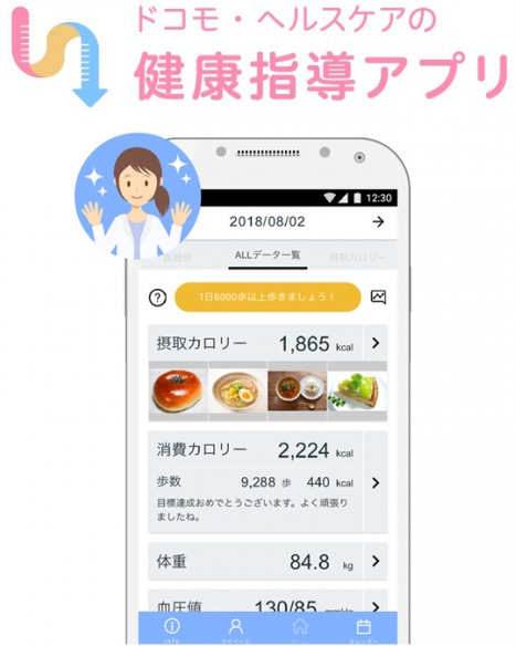 ドコモ・ヘルスケア(株)が提供する特定保健指導サービスアプリ「カロリーマネジメントプラン」に食事・運動・体重などの生活習慣を記録して、自動アドバイスや栄養士からの月次レポートを確認する。面談予約や遠隔面接もできるため、スマートフォンで特定保健指導できる。費用はマツモトキヨシグループ健康保険組合が全額負担する。