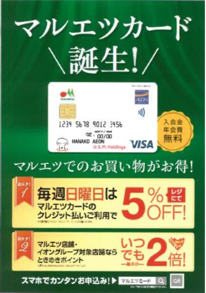 毎週日曜日に「マルエツカード」のクレジットで支払った時には、「5%OFF」の特典を付ける。また、マルエツとイオングループの対象店舗で、マルエツカードのクレジットで支払った場合には、同社の「ときめきポイント」を税込み200円に付き2ポイント付与する。これは基本の2倍に当たる。