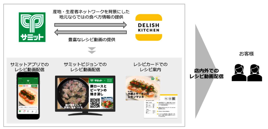 今回の提携により、スマートフォンで使えるサミットアプリや、サミットストア店頭デジタルサイネージのサミットビジョンへの「DELISH KITCHEN」レシピ動画の配信がエブリーによって行われる。