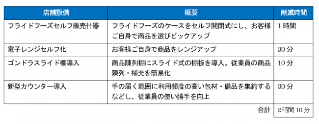 またローソンでは、自分の好みの温度に温めることができる電子レンジのセルフ化、従業員の商品陳列や補充を簡易化するゴンドラスライド棚や新型カウンターの導入も合わせて行い、合計で1日当たり2時間10分の店舗作業時間削減につなげている。